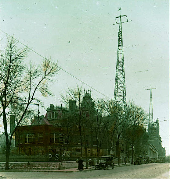 View of the BJ Palmer Mansion, sharing the same block as the Palmer School of Chiropractic with the WOC radio towers on top. circa 1922
